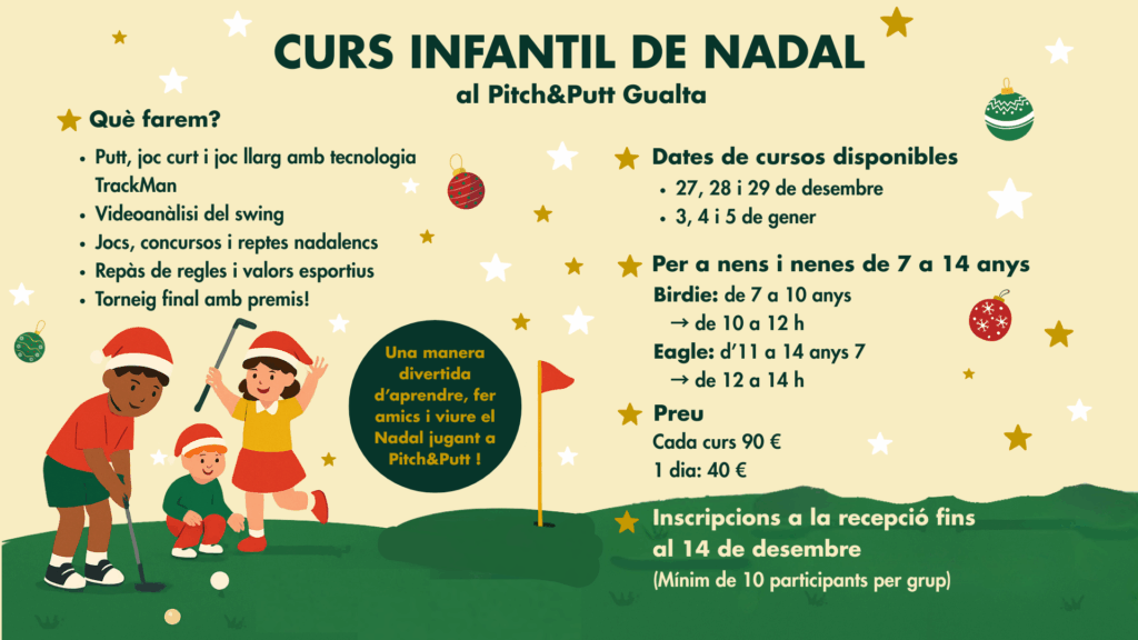 Aquest Nadal torna una de les activitats més esperades pels més petits: el Curs Infantil de Nadal del Par3 Pitch&Putt Gualta! Una oportunitat perfecta perquè nens i nenes gaudeixin d’uns dies a l’aire lliure, aprenent tècnica, valors i convivència mentre descobreixen totes les possibilitats del nostre esport.