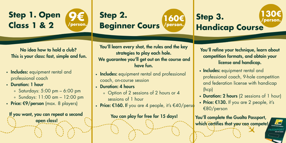 Includes club hire and range balls. On course training with a professional, 3 free greenfee for the first 15 days after the course completion.