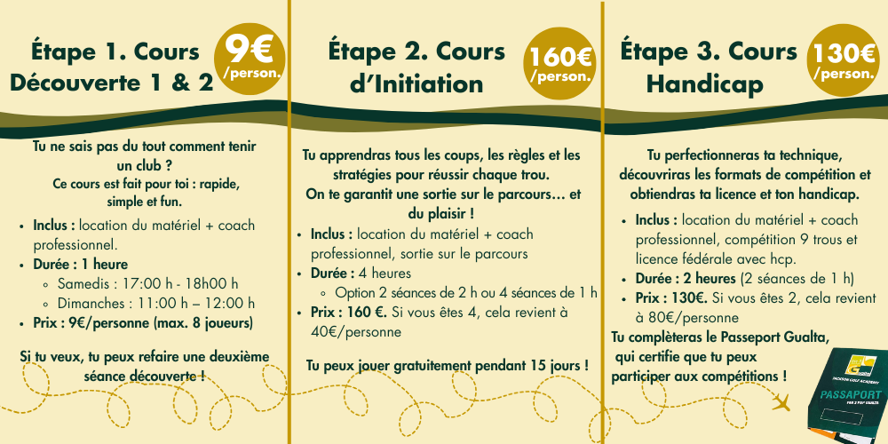 Comprend la location des clubs, balles de practice, sortie sur le parcours avec le professeur et jouer 3 fois gratuitement les 15 jours suivants en conclusion du cours.